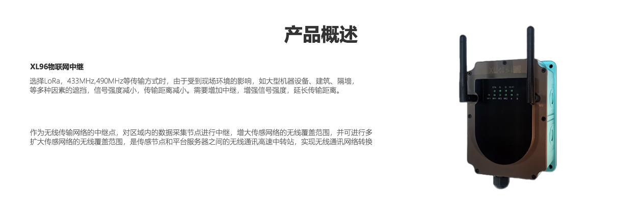 XL96物聯網中繼,作為無線傳輸網絡的中繼點,對區域內的數據采集節點進行中繼,增大傳感網絡的無線覆蓋范圍,并可進行多級中繼。