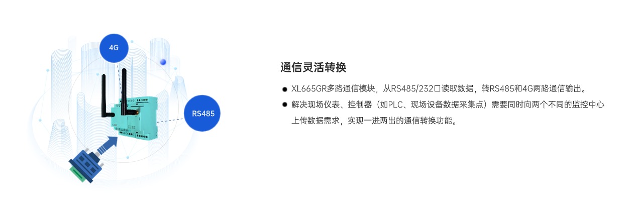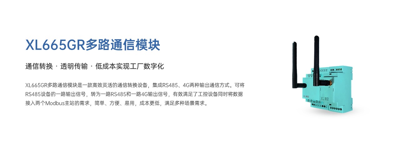 XL665GR多路通信模塊是一款高效靈活的通信轉換設備,可將RS485設備的一路輸出信號,轉為4G和RS485兩路輸出信號,有效滿足了工控設備同時將數據接入兩個Modbus主站的需求,簡單、方便、易用,成本更低,滿足多種場景需求。