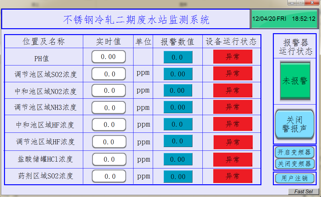 通過有線方式將現場的S02、N02、HCl、NH3、HF這5種氣體傳感器以及PH傳感器所采集的數據實時傳輸至值班室終端顯示屏,當氣體超限時自動打開變頻器,使風機運行。1.每臺S02、N02、HCl、NH3、HF氣體傳感器需擁有防爆外殼,具備聲光報警功能;有觀察窗實時查看氣體值;