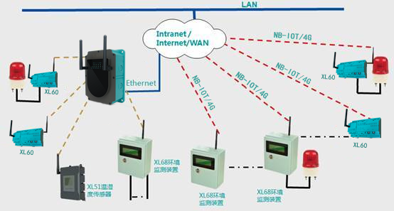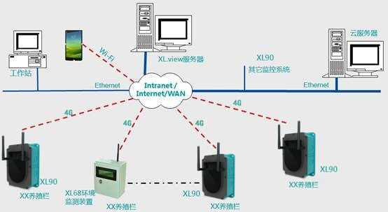 XL68智能環境監測終端(裝置),采集空氣溫濕度、H?S、NH?、O?、CO?等等氣體濃度,光照、差壓等等信號;簡單應用中選擇XL51溫濕度傳感器采集空氣溫濕度;XL60無線采集裝置控制養殖欄內的參數,起動風機、加熱裝置、濕簾、照明,起動聲光報警器,采集用水量、用電量、水壓等等用戶關注的參數。
