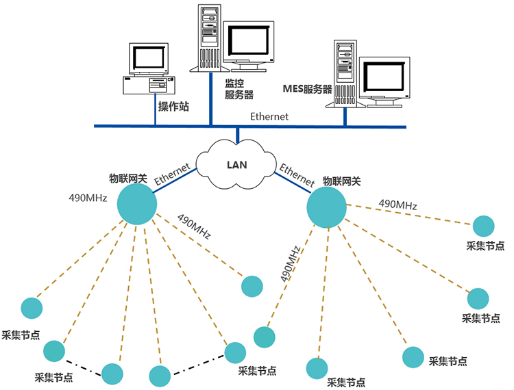 采集節點,通過490MHz無線上傳數據至物聯網關,網關通過Ethernet,接入LAN,推送數據至MES服務器