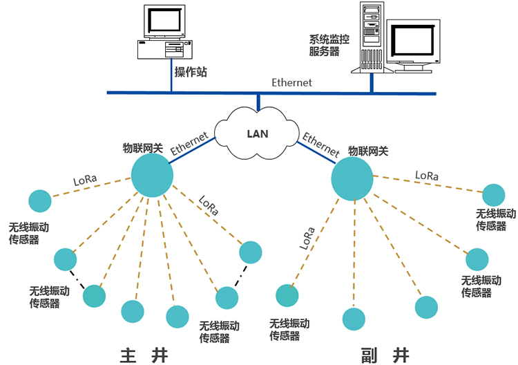 在主井、副井各安裝1臺(tái)物聯(lián)網(wǎng)關(guān),無(wú)線讀取振動(dòng)傳感器的數(shù)據(jù),通過(guò)LAN(局域網(wǎng)),上專(zhuān)數(shù)據(jù)到監(jiān)控服務(wù)器;