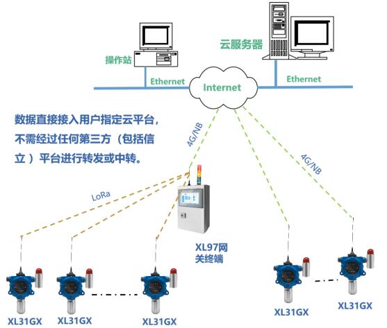 l XL31GX智能氣體檢測(cè)儀,通過LoRa接入網(wǎng)關(guān)終端,網(wǎng)關(guān)終端通過4G接入云平臺(tái)。