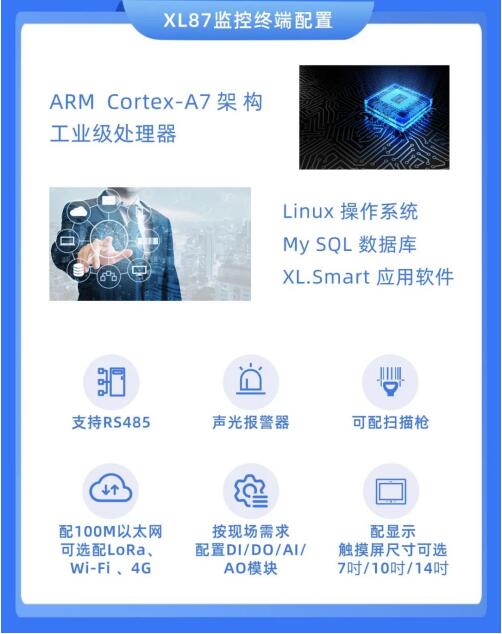設(shè)備選型:選擇XL87監(jiān)控終端,搭配相應(yīng)技術(shù)參數(shù)的傳感器、流量計(jì)、水表計(jì)量裝置等,可實(shí)現(xiàn)對(duì)上述生產(chǎn)數(shù)據(jù)的采集,進(jìn)而分析、判斷、追溯產(chǎn)品質(zhì)量,判斷設(shè)備效率、運(yùn)行經(jīng)濟(jì)性等指標(biāo)。