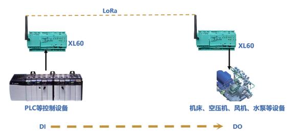 一對 XL60 無線采集裝置 ,一臺與 PLC 等控制儀表連接,作信號發射端;一臺配置在生產現場,作信號接收端。發射端的 XL60 將控制儀表的啟停命令,通過 LoRa 無線對傳到接收端,接收端的 XL60 輸出開關量信號,控制設備啟、停。