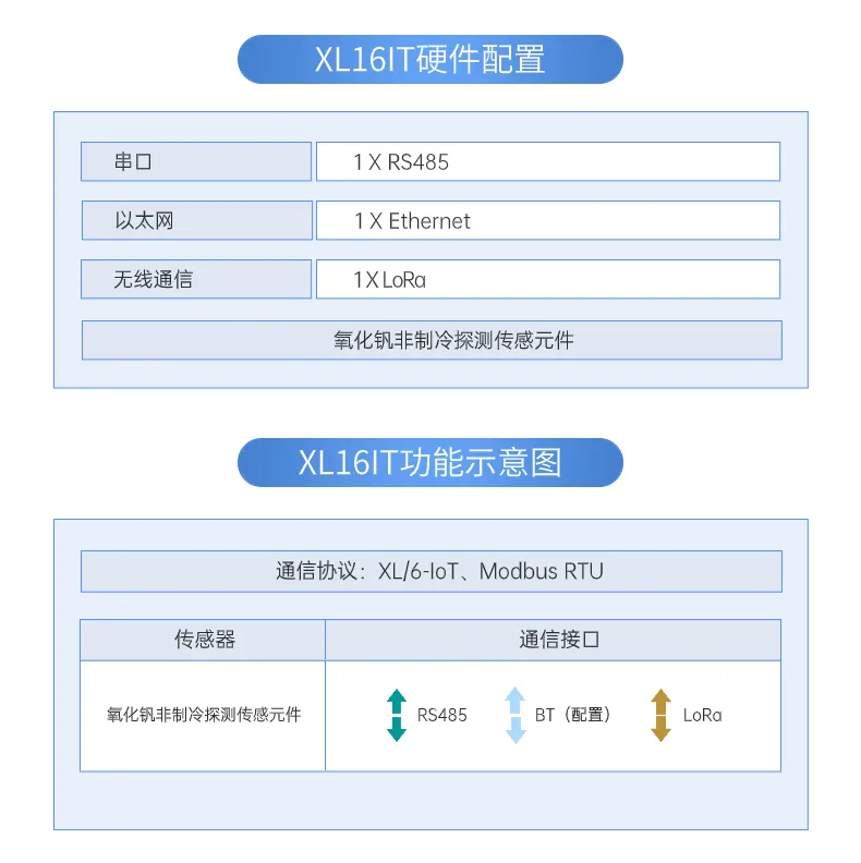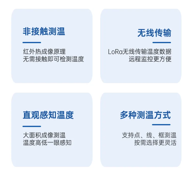 采用XL16IT無線紅外熱成像測溫傳感器,實現(xiàn)對配電柜、變壓器等電氣設(shè)備母線、銅排、電纜連接部位的非接觸式溫度監(jiān)測。配置氧化釩非制冷型探測元件,可同時監(jiān)測10個點、10個框、1條線的溫度,測溫范圍廣、精度高。