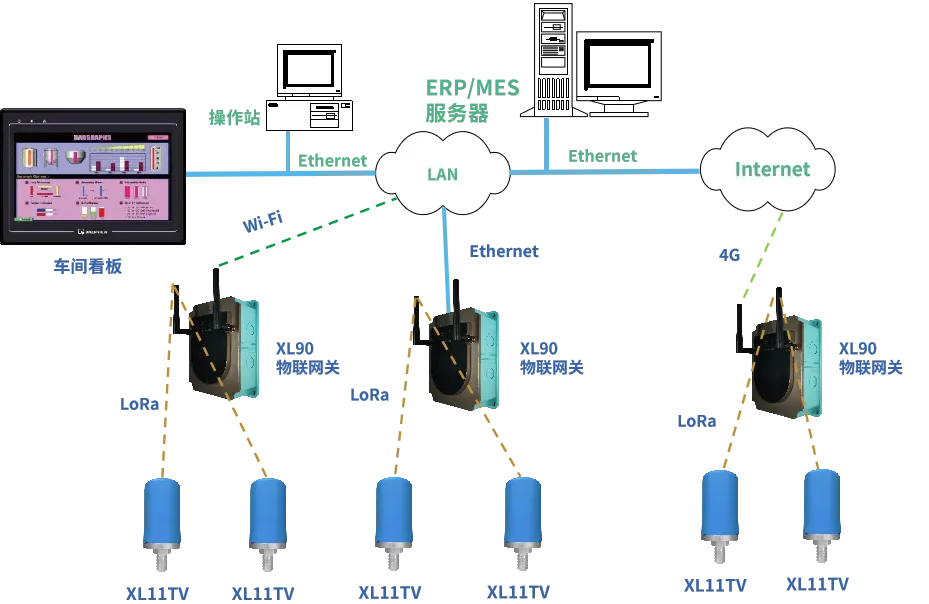 監(jiān)測系統(tǒng)采用無線傳輸設(shè)計,XL11TV溫振傳感器采用LoRa 無線傳輸數(shù)據(jù)給XL90網(wǎng)關(guān),網(wǎng)關(guān)對數(shù)據(jù)進(jìn)行協(xié)議轉(zhuǎn)換后,通過Ethernet/WiFi/4G傳輸數(shù)據(jù)至監(jiān)控平臺。